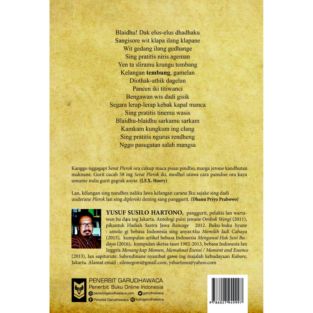 Purwadi, m.hum eko priyo purnomo, sip —————————————————… Geguritan utawa puisi basa jawa ora kaiket dening paugeran tartamtu kayata tembang macapat. Kini, bahasa jawa telah digunakan di berbagai media, mulai dari buku hingga acara televisi. Setiap bait tembang macapat memiliki baris kalimat yang disebut gatra, dan setiap gatra memiliki sejumlah guru wilangan (suku kata) tertentu, dan diakhiri dengan bunyi sajak akhir yang disebut guru lagu. Geguritan yaiku salah sijining sastra jawa kang asale saka rasa ing ati, banjur diungkapake penyair nganggo bahasa kang nduweni irama, rima, mitra, lan tatanan lirik kang nduweni arti/ makna tartamtu. 27.10.2020 · sastra jawa memiliki berbagai macam bentuk, mulai dari puisi, prosa, pantun, lagu yang sebutannya berbeda dalam sastra indonesia, meskipun memiliki beberapa kesamaan.